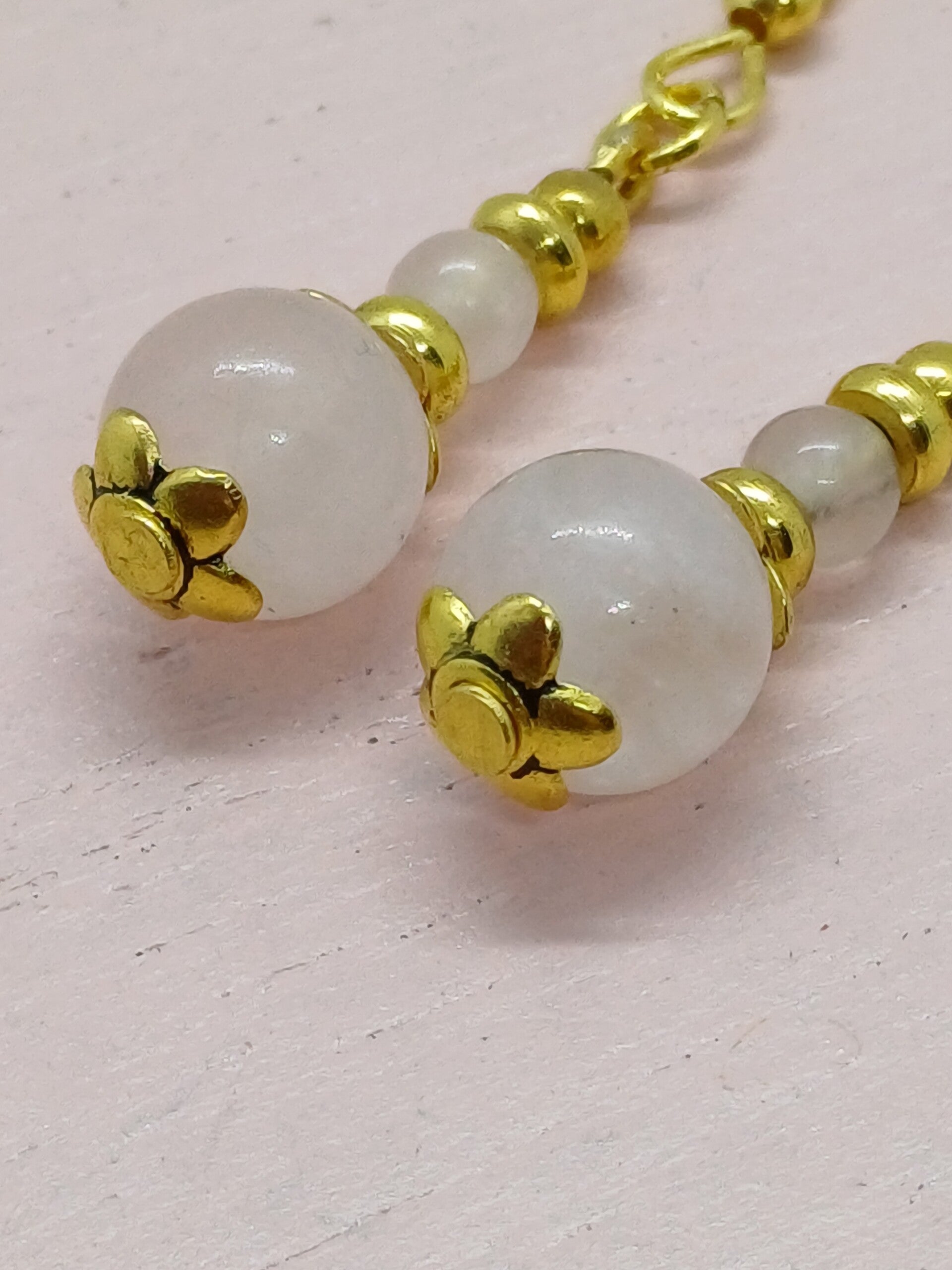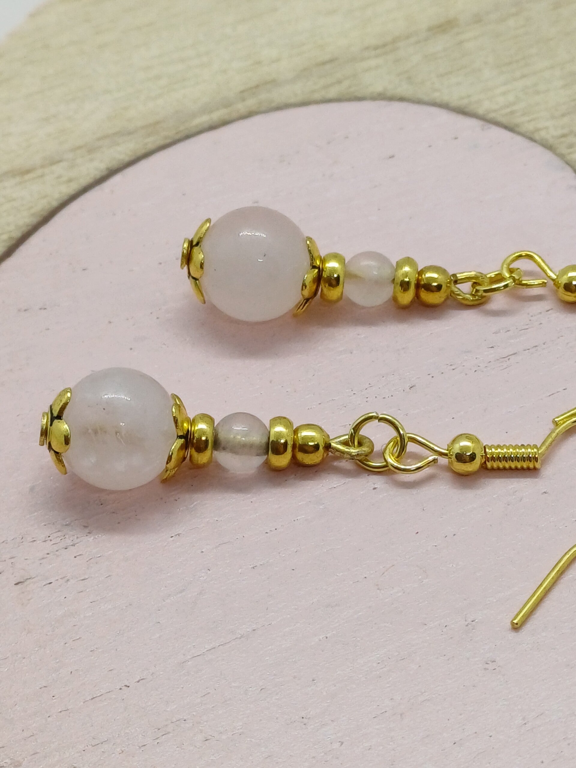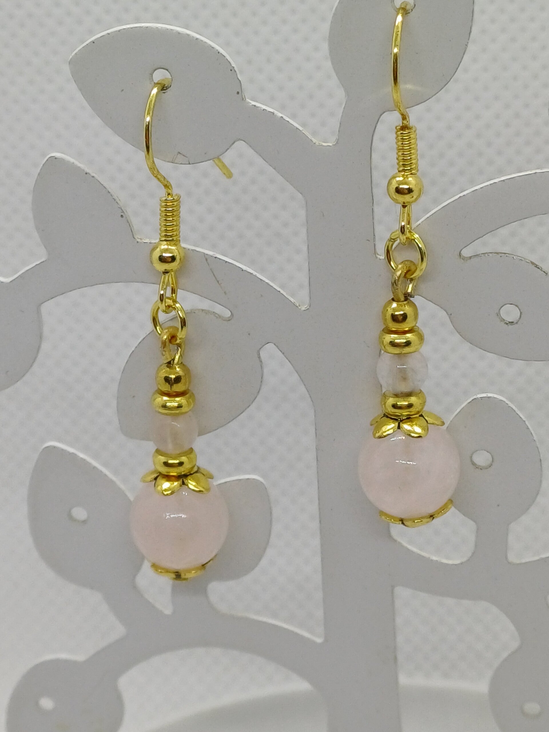 Moderne goudkleurige oorbellen met Rozenkwarts parels -8 mm-4 mm en afgewerkt met nikkelvrij materiaal - diameter 5 x 1 cm .
