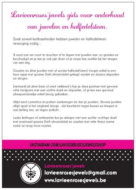 Alle juwelen worden mooi verpakt en met een poetsdoekje en een folder met uitleg over de werking en onderhoud van juwelen met halfedelsteen verzonden.