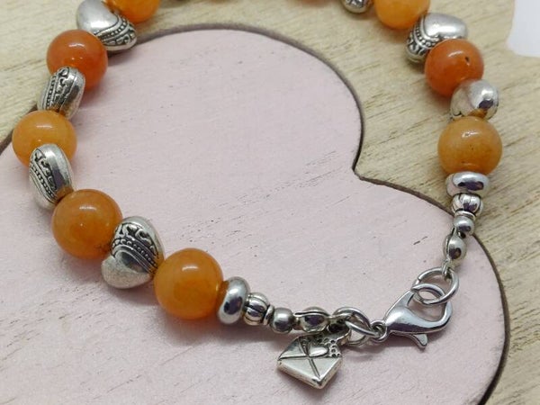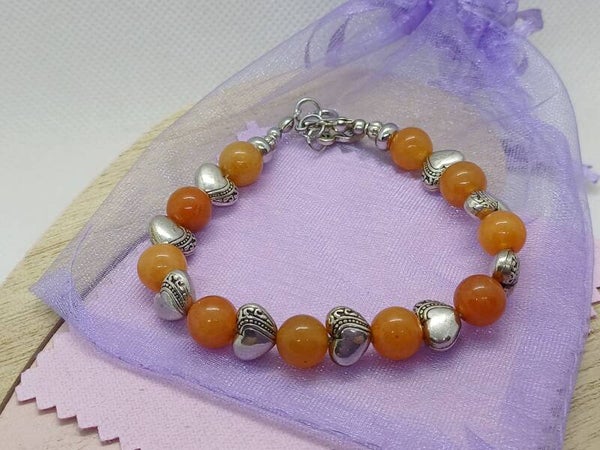 Moderne armband met orange aventuryn parels -8mm en hartjes parels -7mm- en afgewerkt met nikkelvrij materiaal en verkrijgbaar in alle maten en ook met paarse amethist of maansteen .