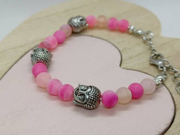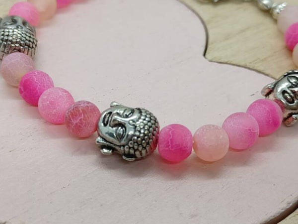 Moderne handgemaakte armband met matte roze agaat parels -8mm en afgewerkt met zilverkleur nikkelvrije boedha parels en materiaal.