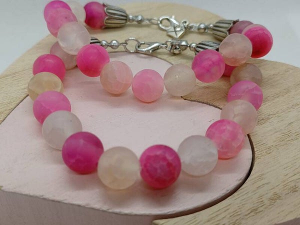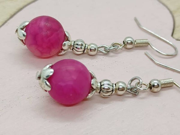 Moderne oorbellen met grote matte donker roze agaat parels -10mm- en afgewerkt met zilverkleurig nikkelvrij materiaal -diameter 4 x 1 cm - ook verkrijgbaar met lichte roze agaat .