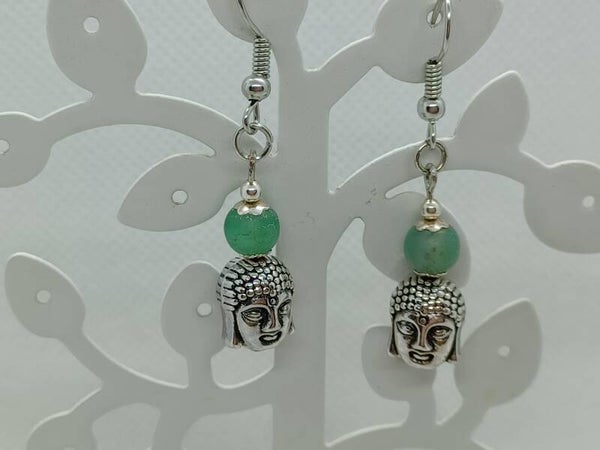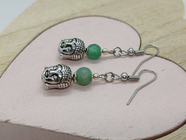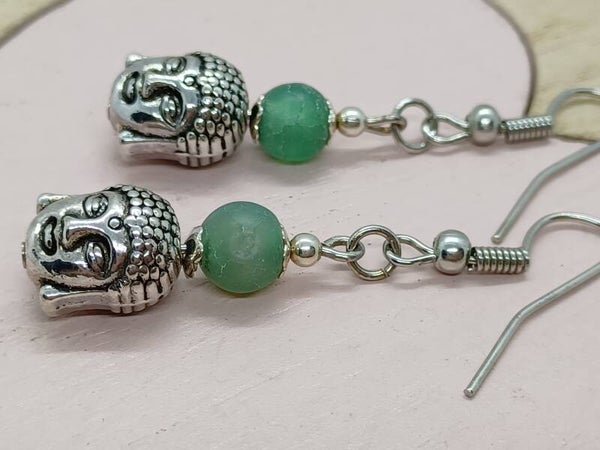 Moderne oorbellen met matte groene Agaat parels-6mm- en afgewerkt met zilverkleurige nikkelvrije boedha parels -8mm- en franse haakjes - diameter 4 x 1 cm .