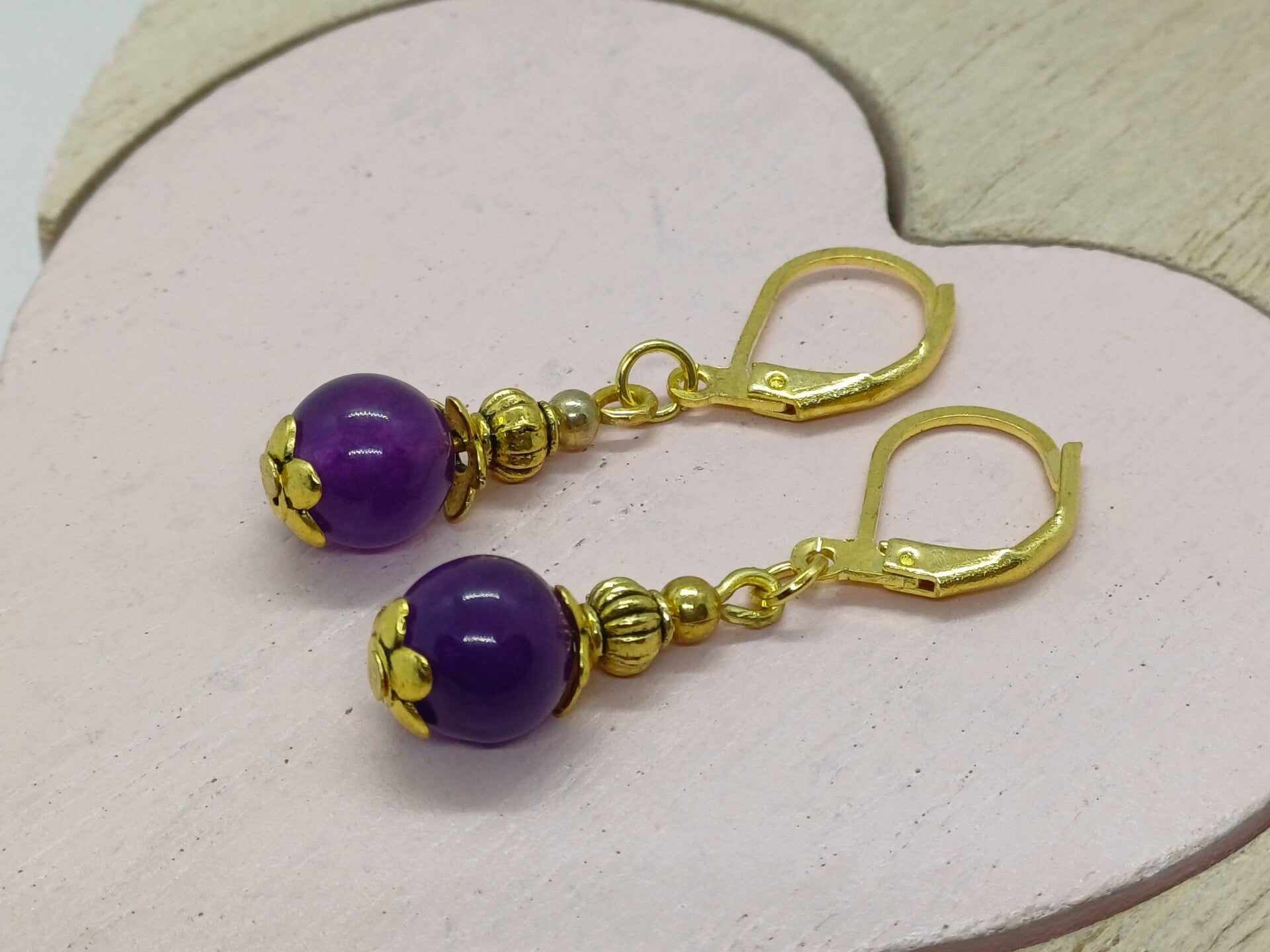 Moderne korte goudkleurige oorbellen met 1 paarse amethist parel -6mm en afgewerkt met nikkelvrij materiaal en klaphaakjes . Diameter van dit juweel is 4 x 1 cm en is ook verkrijgbaar met Rozenkwarts - Aventuryn- jade -kwarts verder in de shop .
