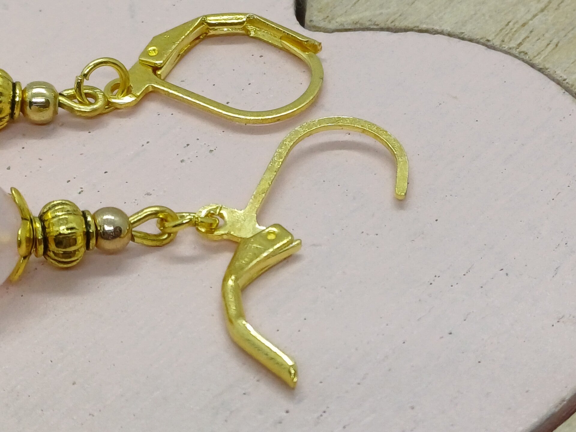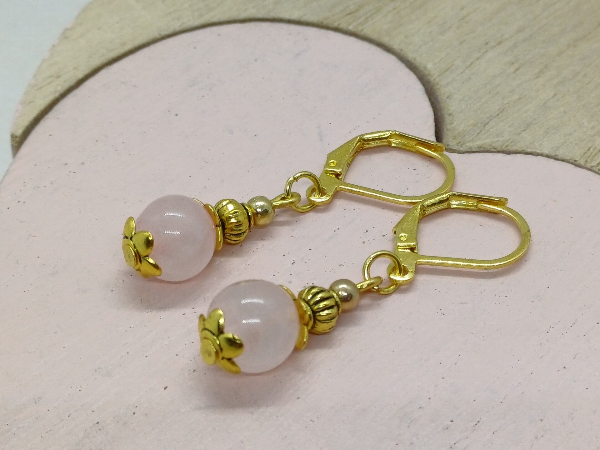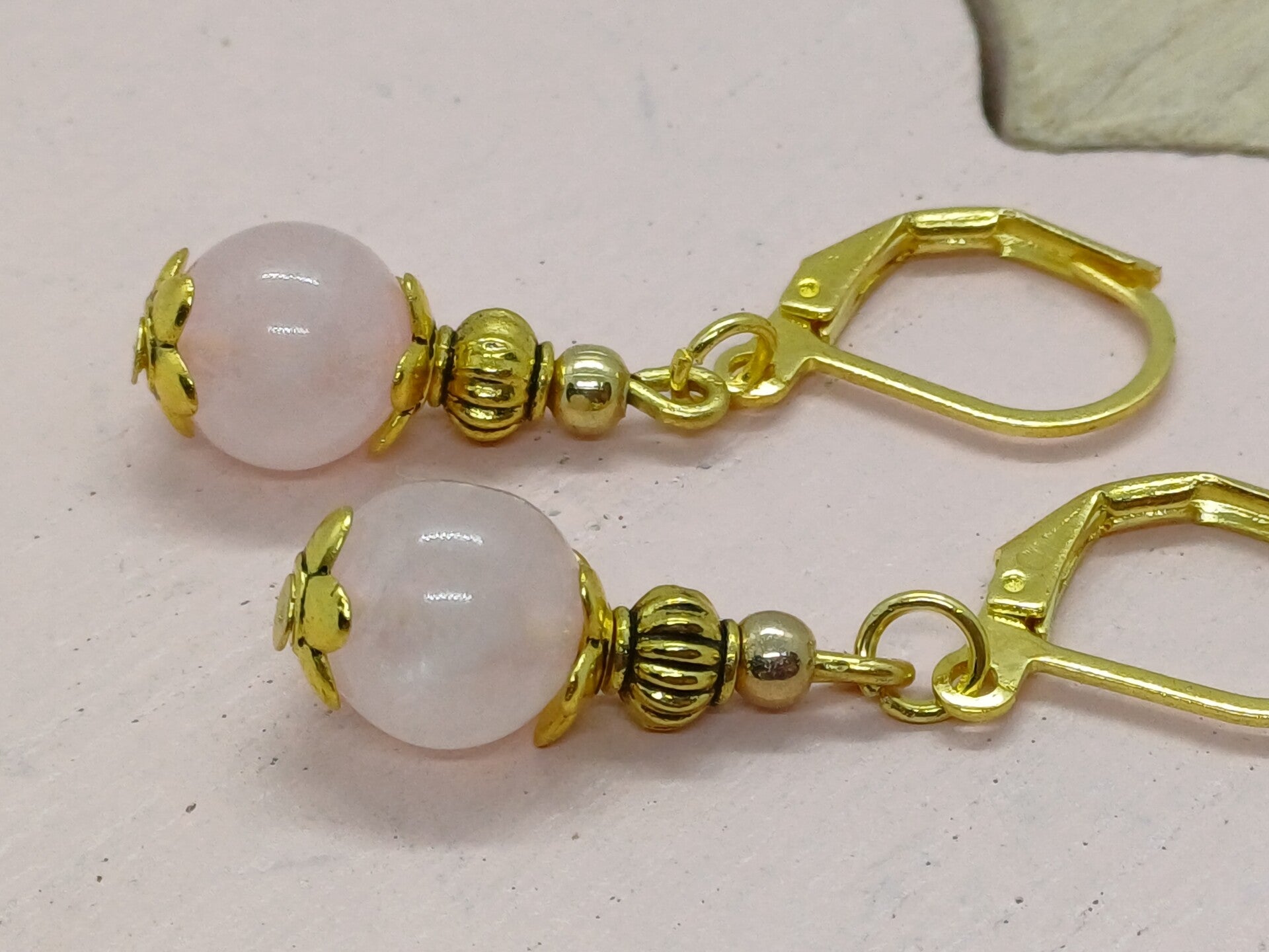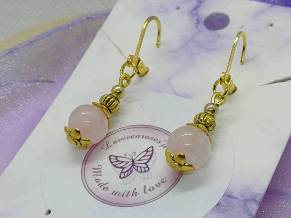Moderne goudkleurige oorbellen met een Rozenkwarts parel-8mm- en afgewerkt met nikkelvrij materiaal en klaphaakjes .