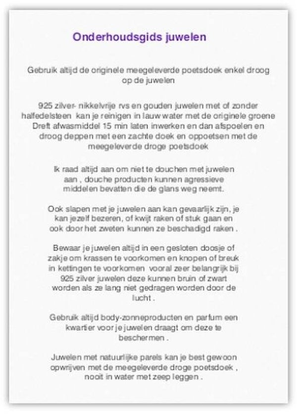 Standaard zijn alle juweeltjes leuk verpakt met een poetsdoekje en een folder met uitleg over de werking en onderhoud van het aangekocht juweel .