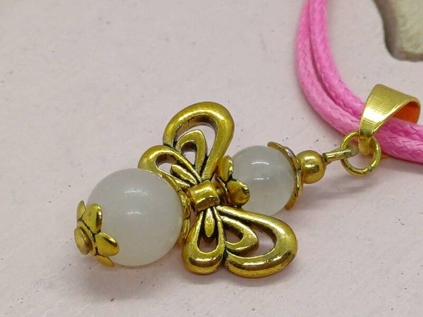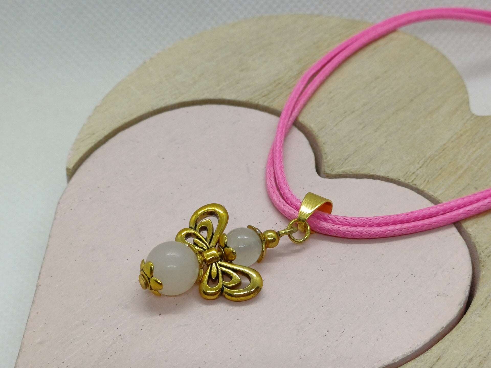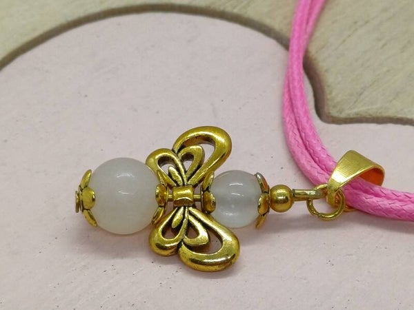 Moderne handgemaakte hanger met een engel met rozenkwarts parels- 8 -6 mm en afgewerkt met goudkleurig nikkelvrij materiaal.
