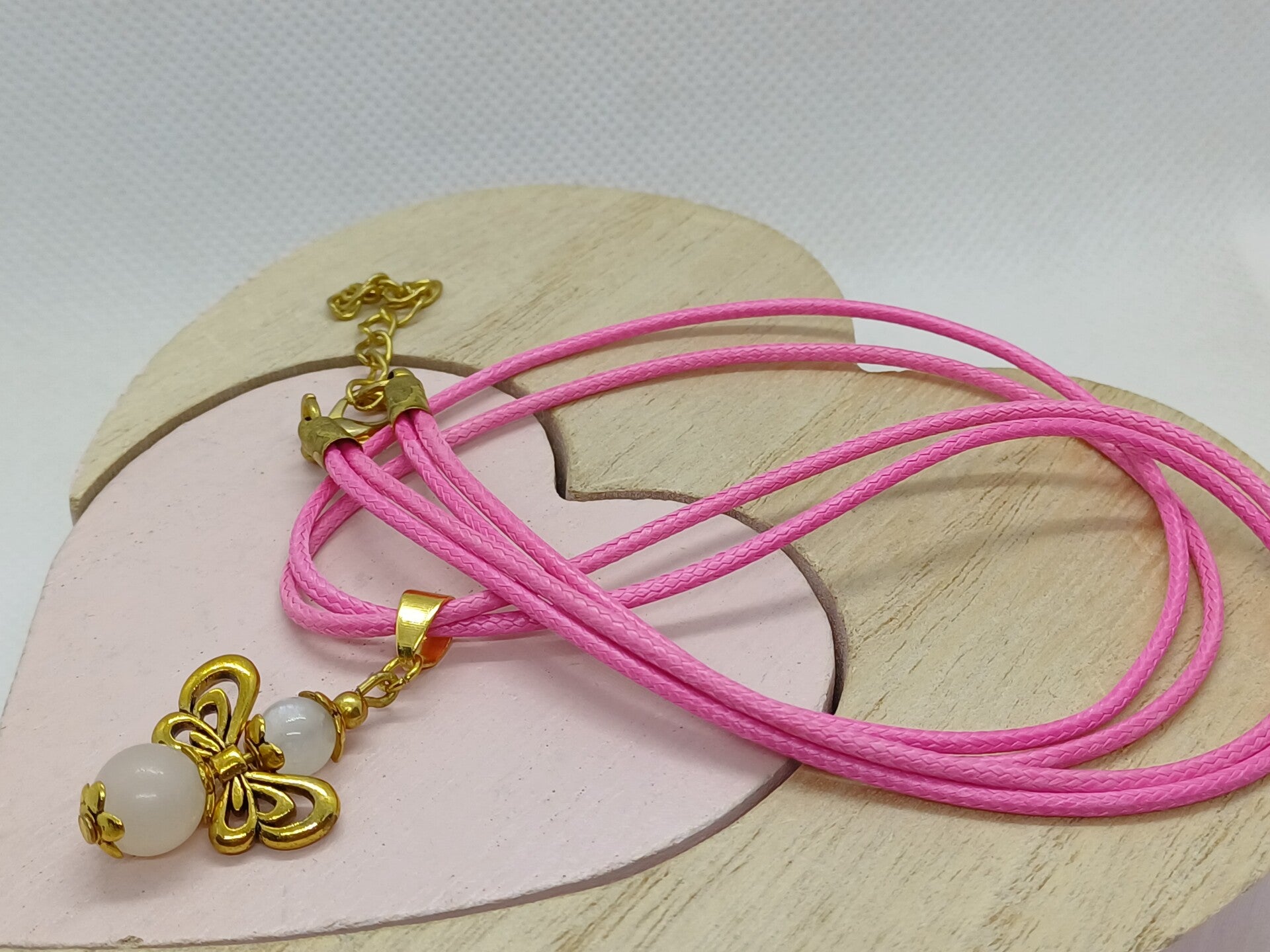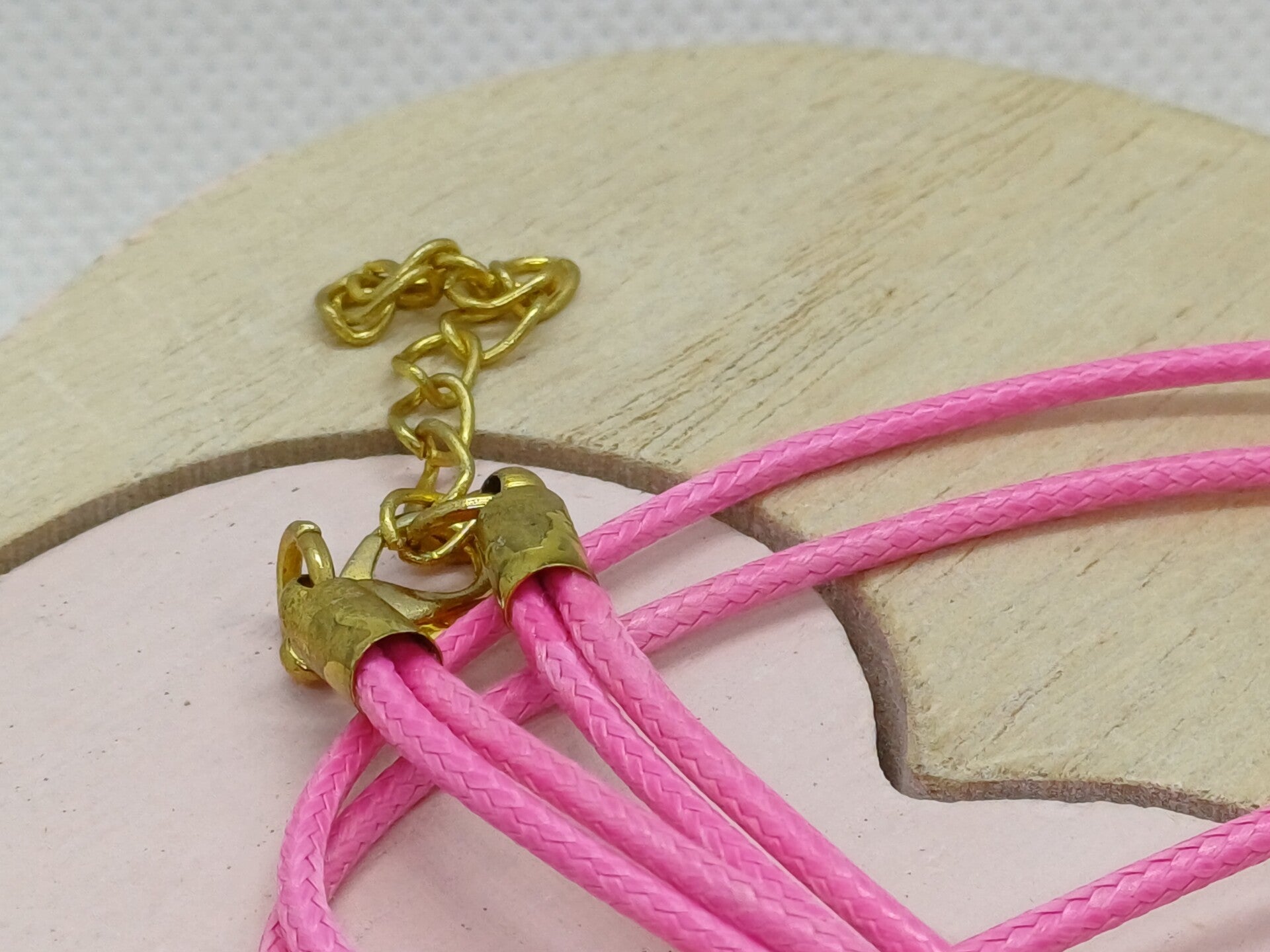 Diameter van de hanger 5 x 1,5 cm en wordt geleverd met een donkere roze dubbele waxkoord ketting naar keuze van 45 cm tot 65 cm.