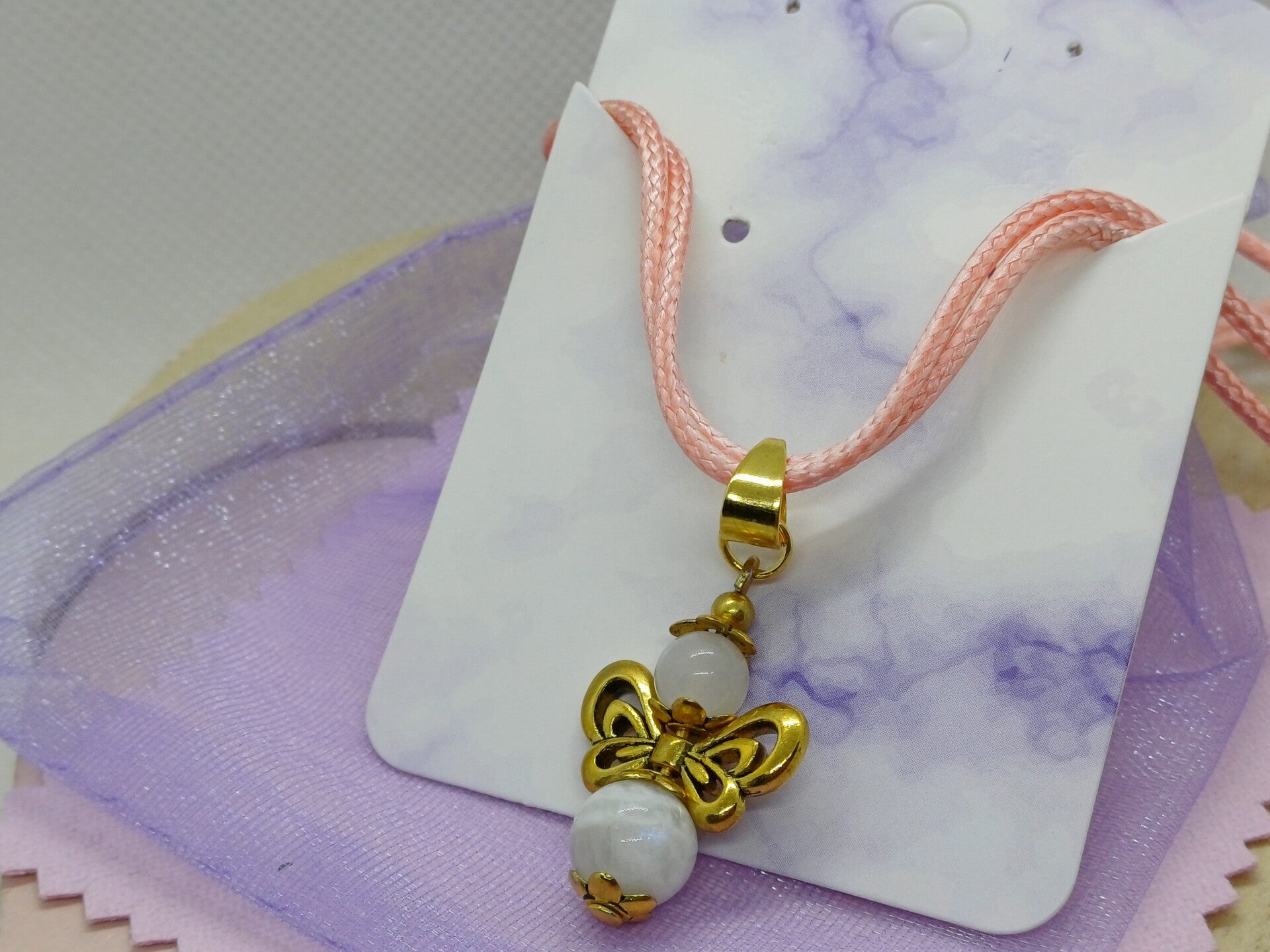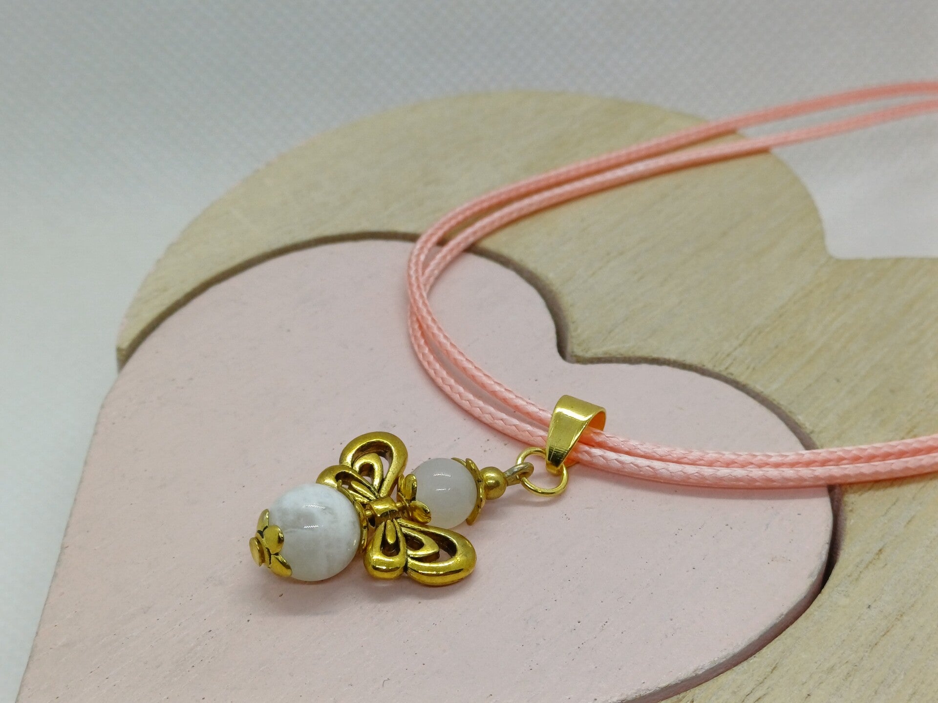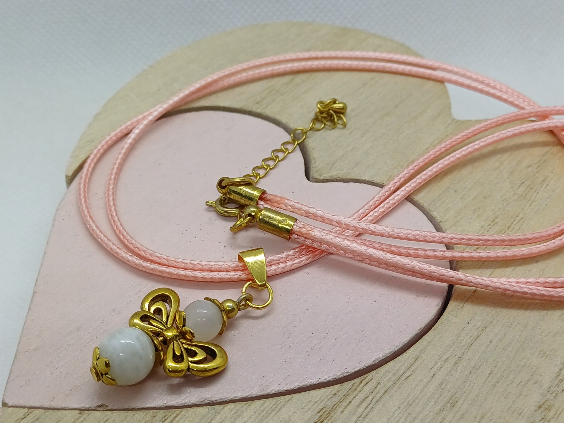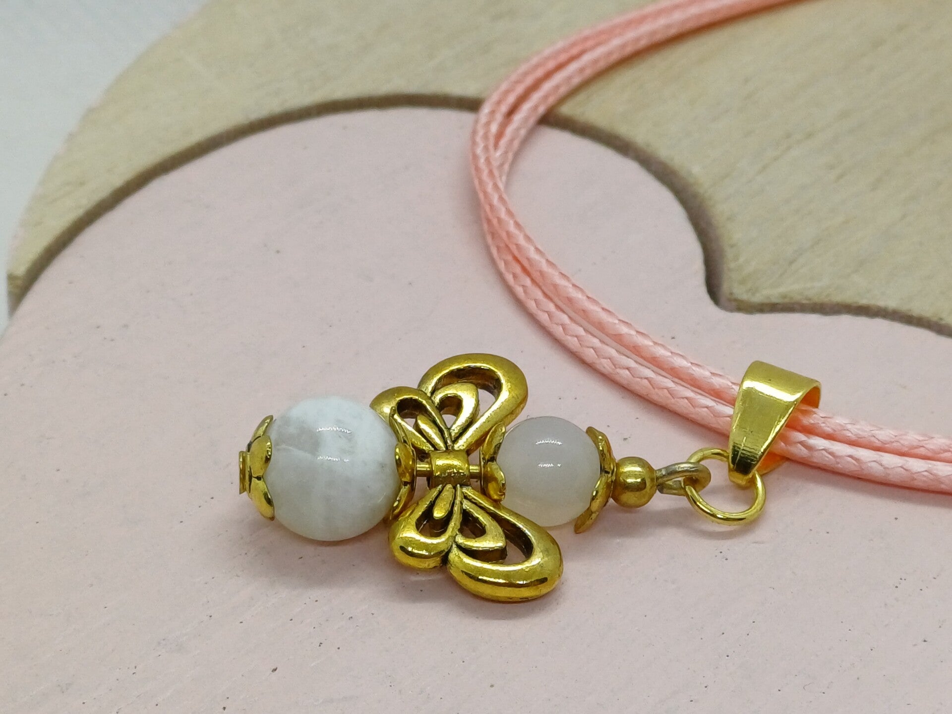 Moderne handgemaakte hanger met een engel met een maansteen -8mm en rozenkwarts -6mm parels en afgewerkt met goudkleurig nikkelvrij materiaal.