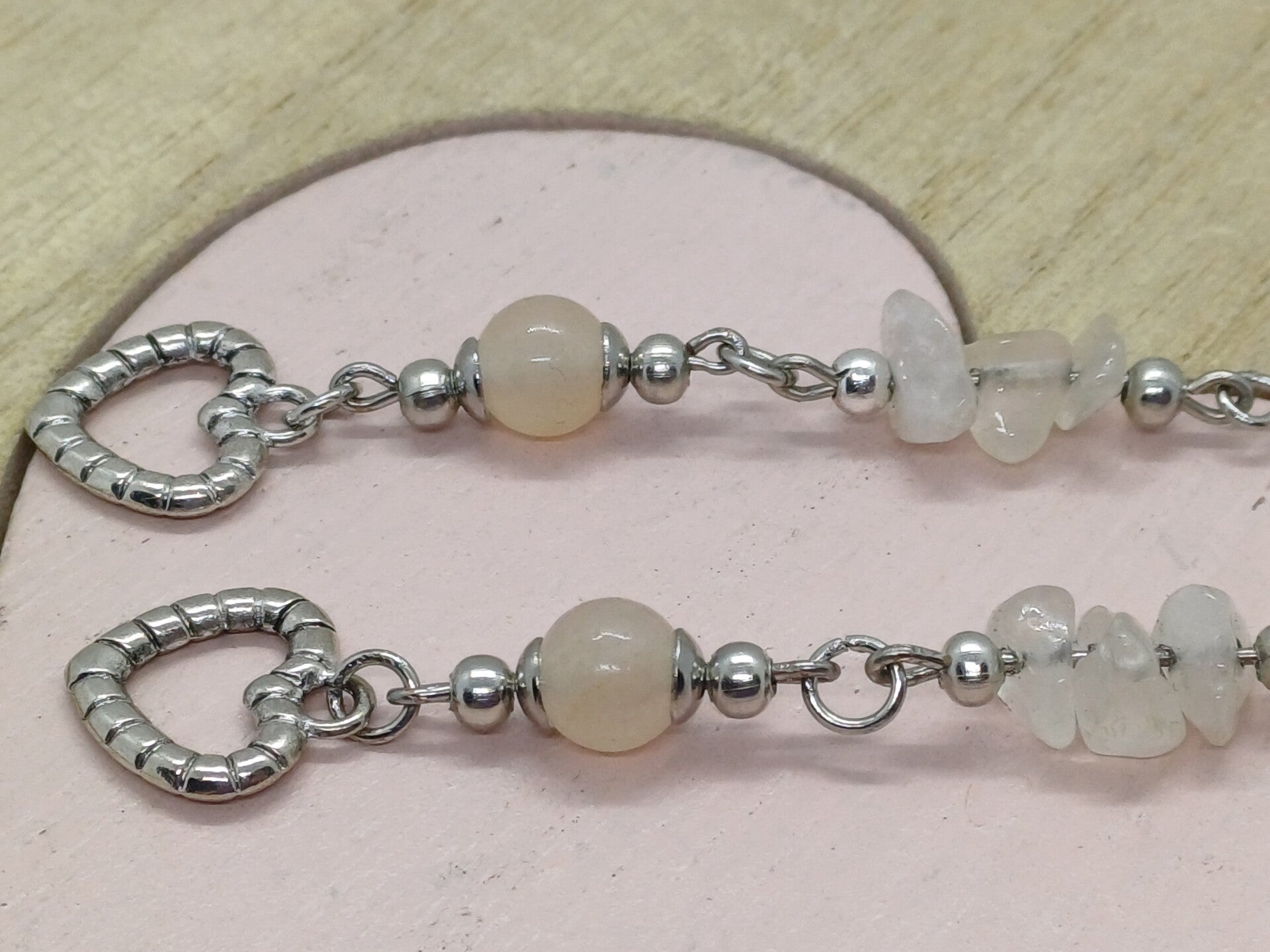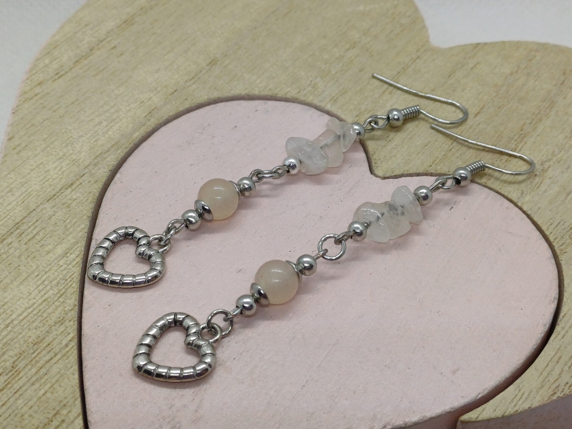 Moderne handgemaakte oorbellen met een rozenkwarts parel-6mm en ruwe rozenkwarts parels en een Tibetaans 925 zilver hartje-1x1 cm en afgewerkt met nikkelvrij materiaal.